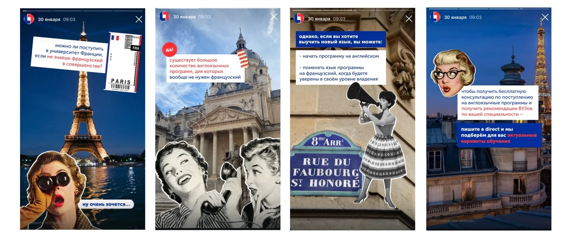 Делаем промо для прямых эфиров, которые проводим в телеграм-канале Quartier Latin, также делали сезонные промо для рекламы поступлений в зарубежные ВУЗы и адаптации во Франции.