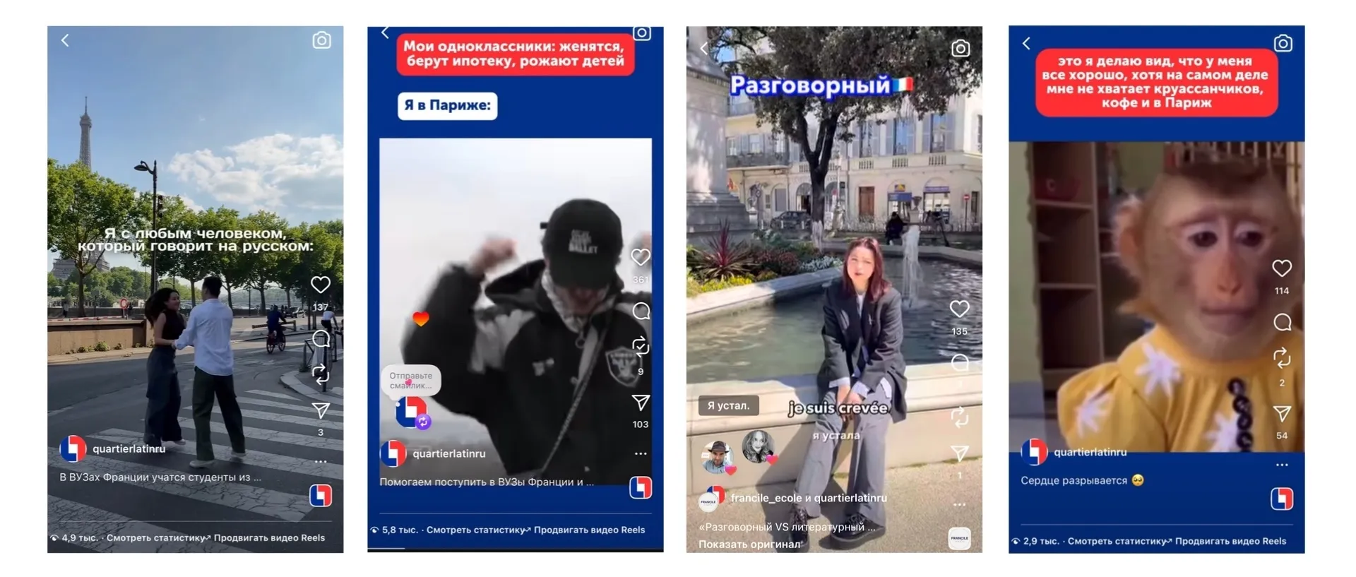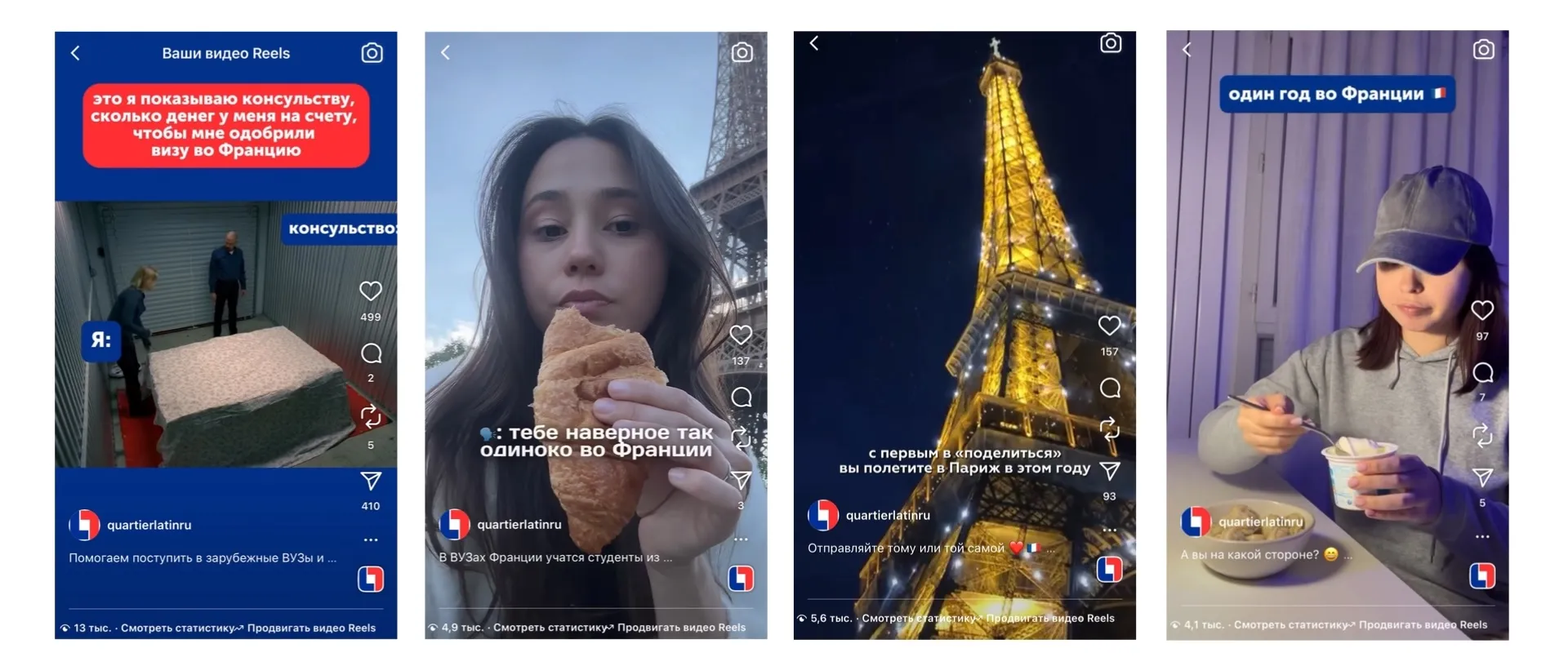 С блогерами реализовываем совместные рилс с реальными историями, где Quartier Latin помог поступить, найти квартиру, получить студенческую визу или разобраться во французской бюрократии.