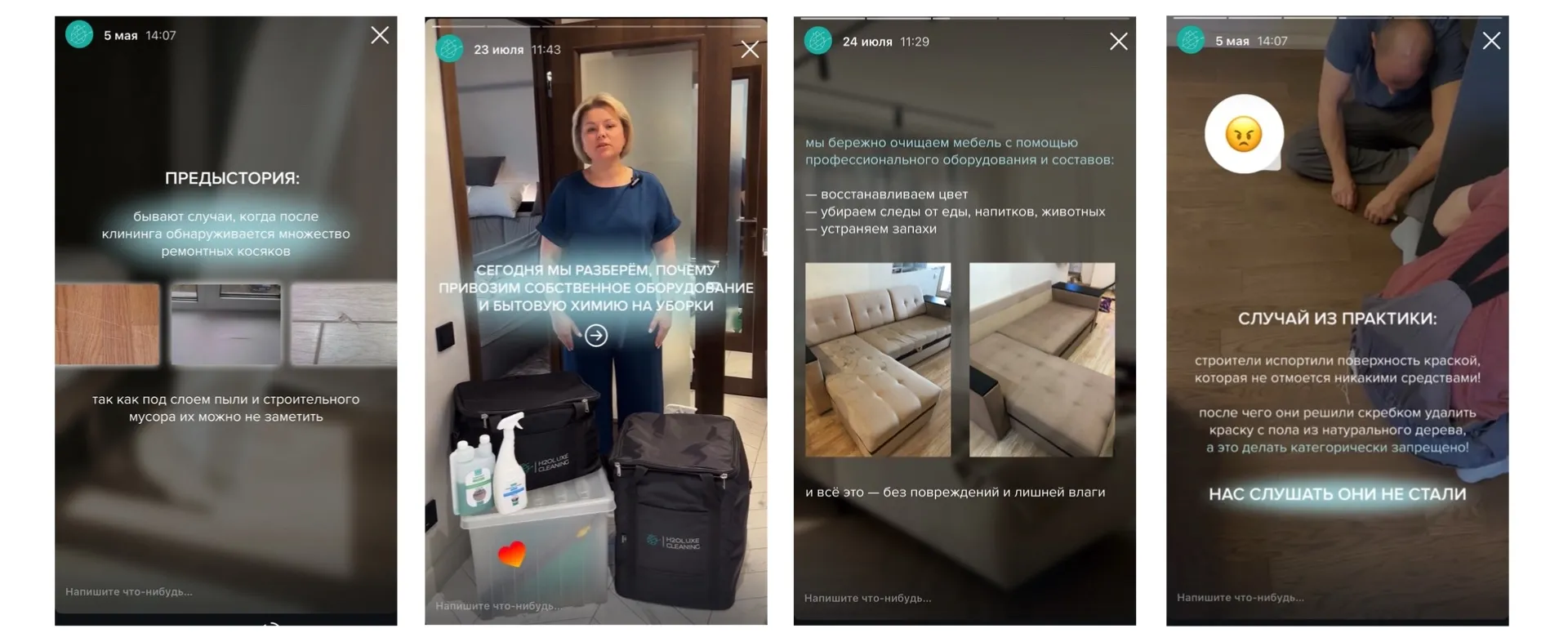 Такой подход увеличил досматриваемость на 40%, а вовлечённость — на 110%. Добавили тесты, опросы и ответы на вопросы клиентов в развернутых сторителлингах. Внедрили сторителлинги о кейсах, сделали акцент на глобальный подход H2O к уборке, проиллюстрировали это видео с работой клинеров на объектах (для этого мы также еженедельно выезжаем на объекты) и результате на контрасте.